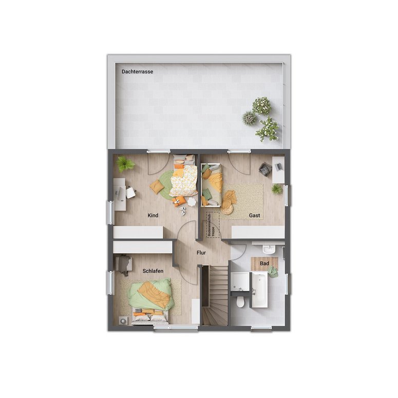 Stadthäuser sind nach wie vor besonders beliebt. Aber nicht jeder Bauherr wünscht sich ein kubisches Haus. Mit einem Staffelgeschoss können Sie das Design auflockern, ohne gänzlich auf den modernen Stil zu verzichten. Und das Beste: Sie gewinnen zusätzliche Wohnfläche im Erdgeschoss, da dieses größer als beim klassischen Stadthaus ist.